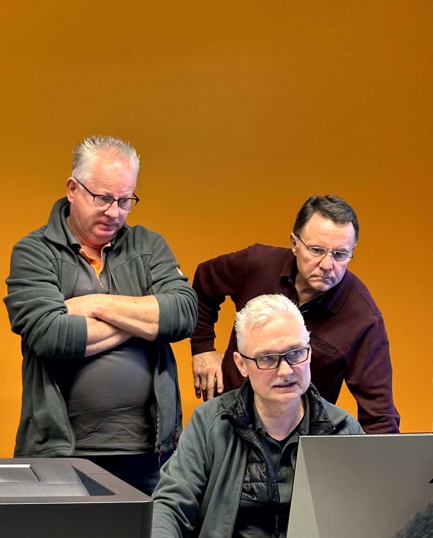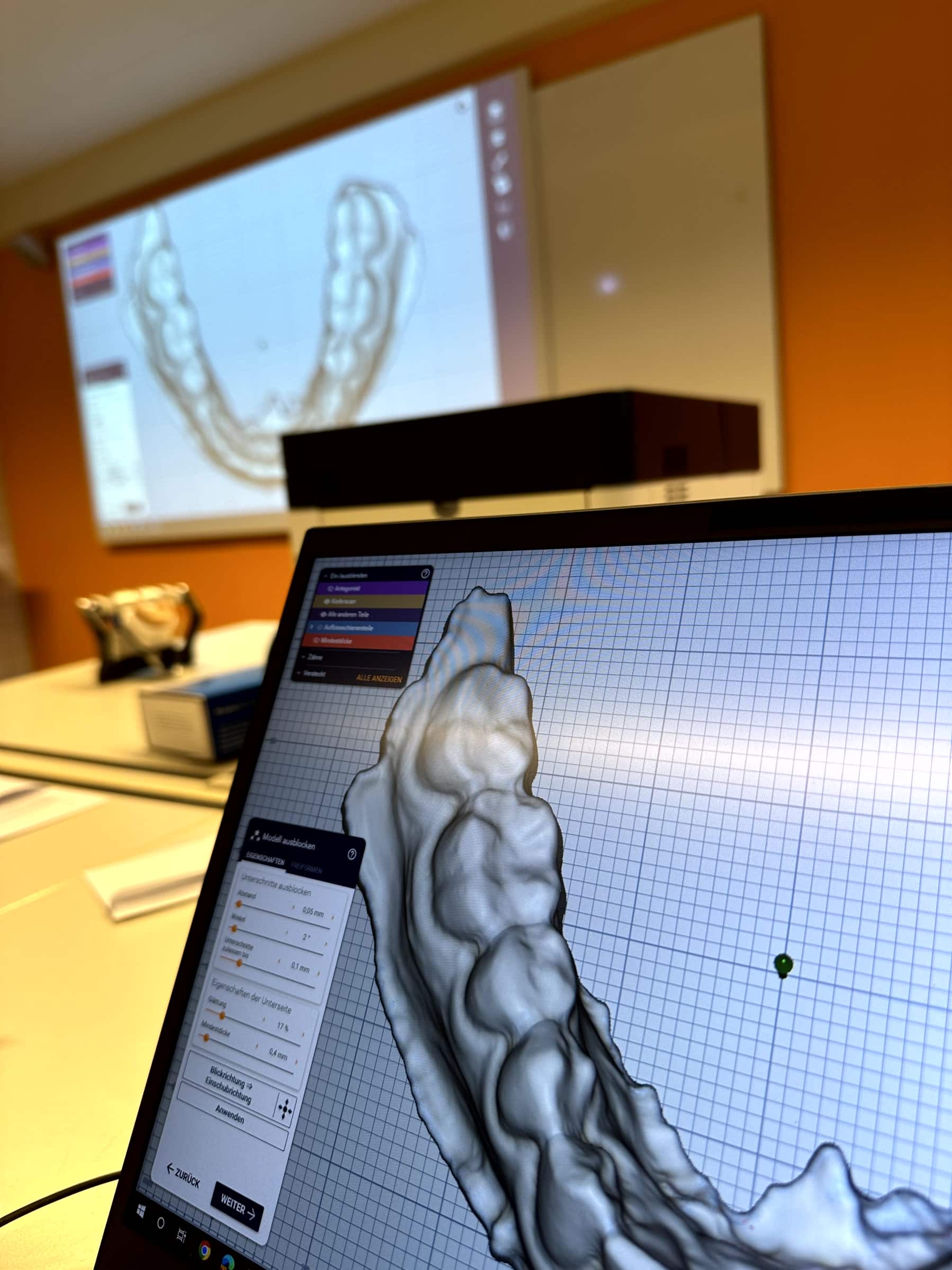 Begleitet durch Martin Liebel von der Firma Amann Girrbach wurden die im kommenden Frühjahr anstehenden, erstmals nach der neuen Ausbildungs- und Prüfungsordnung durchzuführenden Abläufe der Gesellenprüfung Teil 1 im Bereich der digitalen Technologien geprobt und verfeinert.
